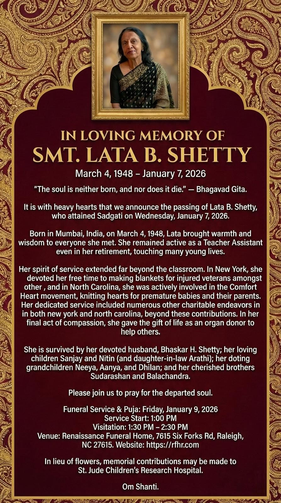 We are deeply saddened to announce the passing of Smt. Lata B. Shetty. who attained Sadgati on Wednesday, January 7th 2026. A compassionate and selfless soul, she dedicated her life to serving others through countless charitable endeavors.